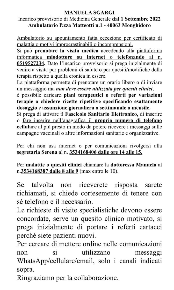 In vista dell’avvio del servizio della Dr.ssa Manuela Sgargi a Monghidoro dal primo settembre p.v. si comunicano le indicazioni inerenti le modalità per l’accesso agli ambulatori e gli orari.
