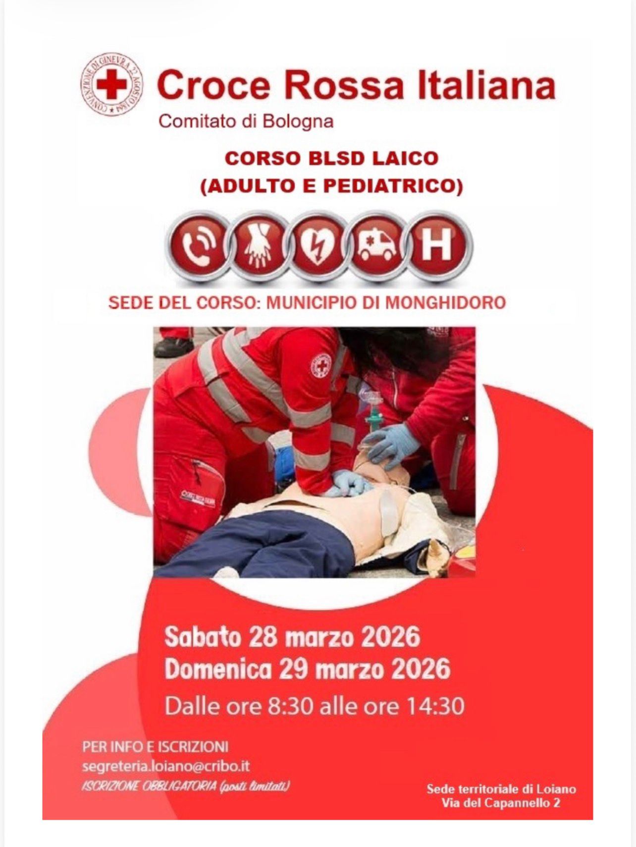 La Croce Rossa Italiana - Comitato di Bologna, con il patrocinio del Comune di Monghidoro, organizza un corso BLSD LAICO (adulto e pediatrico) presso la sala conferenze del Municipio nelle seguenti date: